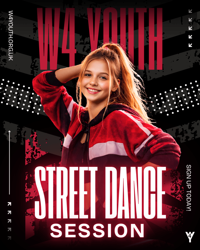 Our FREE weekly street dance sessions are open to young people aged 11–19, focusing on creativity, rhythm, fitness and confidence; make friends and be a part of the W4 Youth Family.